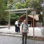 多賀宮に行ったとき、一人の外国人が絵を描いているのに出会った。ちらっと覗き見すると結構上手である。外国人の神社ファンもいるのかと少し話しかけてみる。聞くと、彼はドイツ人で、建築に興味があり、あちこちの建造物を見て廻っているとのこと。5週間前に来日し、九州から北上中だそうな。もっと話をしたかったが、時間もないので先を急いだ。